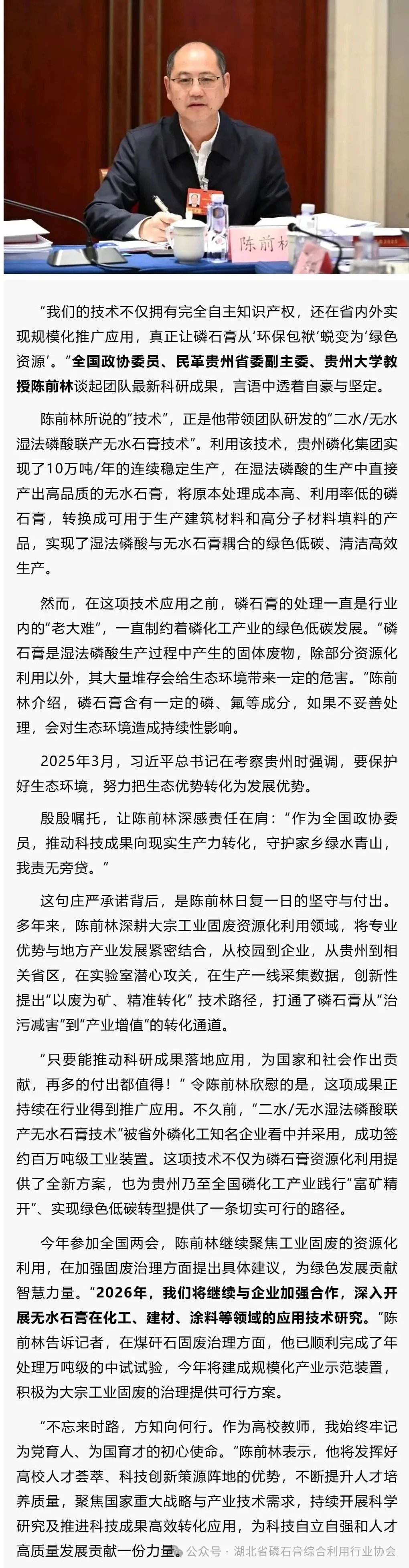 聚焦两会丨全国政协委员陈前林:以科技创新助推磷石膏综合利用