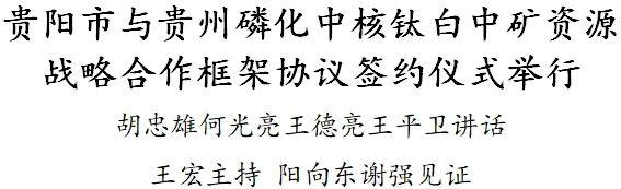 市委副书记、市长王宏主持。贵州磷化党委书记、董事长何光亮,中核钛白磷钛产业牵头人王德亮,中矿资源董事长、总裁王平卫讲话;省国资委主任阳向东,省投促局局长谢强,贵州磷化党委副书记、副董事长、总经理涂文胜,中核钛白董事长、总裁袁秋丽,省有关部门负责人金必煌、高玉平、刘晓阳,市领导范辉政、刘良果参加或见证签约。胡忠雄代表市委、市政府对签约表示祝贺,对企业给予贵阳的支持信任表示感谢。他说,当前,贵阳正深入学习贯彻党的二十届三中全会精神和习近平总书记视察贵州重要讲话精神,大力推进“富矿精开”,加快打造现代化产业体系。此次签约项目好、前景好,符合国家、省发展战略和产业导向,必将为全省、全市发展新能源动力电池及材料产业注入强劲动能。要坚持合作好、服务好,希望合作各方发挥自身优势、推动合作事项落实,各级党委政府将竭诚做好服务、强化要素保障,推动项目快开工快建成快投产。何光亮说,合作将促进三家企业资源链、产业链、技术链形成优势互补,对推动我省新能源电池材料产业延链、补链、强链具有重要意义。希望通过政企携手、企业联合,各方秉持诚实守信、合作共赢的理念,共同促成项目尽快落地,推动实现经济效益、社会效益和生态效益相统一,贵州磷化将积极推进合作事项,助力全省加快打造“六大产业基地”。王德亮说,贵阳资源丰富、营商环境优越,近年来大力推进“工业强市”,已成为投资兴业沃土。此次合作是立足产业发展趋势和企业战略布局作出的重要决策,希望各方共同努力加快建设新能源材料生产基地,打造具有行业影响力的合作典范,为地方发展贡献积极力量。王平卫说,此次政企携手打造新能源材料生产基地,事关三家企业未来发展大局,是为地方经济高质量发展注入新活力的重要举措。希望以此次签约为契机,各方携手开启精诚合作、共赢发展新篇章。根据战略合作框架协议,贵州磷化、中核钛白、中矿资源将共同投资,在贵阳市开阳县新建“磷—硫—钛—铜—铁—锂—氟”耦合循环一体化项目。贵州磷化、中核钛白、中矿资源有关负责人,开阳县和市有关部门负责人参加。