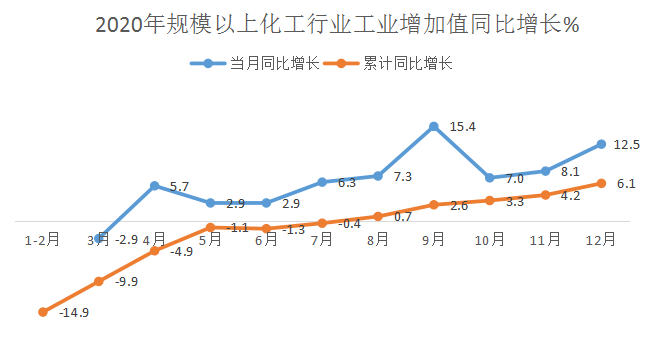 规模以上化工行业增速由负转正。2020年,规模以上化工行业工业增加值同比增长6.1%,增速由上年同期下降转为增长,比全省规模以上工业增加值增速高1.1百分点,拉动规模以上工业增长0.2个百分点。规模以上化工行业1-2月增加值,受新冠肺炎疫情冲击,同比下降14.9%,为年内最低。在省委省政府出台一系列支持企业发展的优惠政策和开展化工产业产销对接工作后,效果逐步展现,自4月起规模以上化工行业当月增加值增速一直保持正增长。