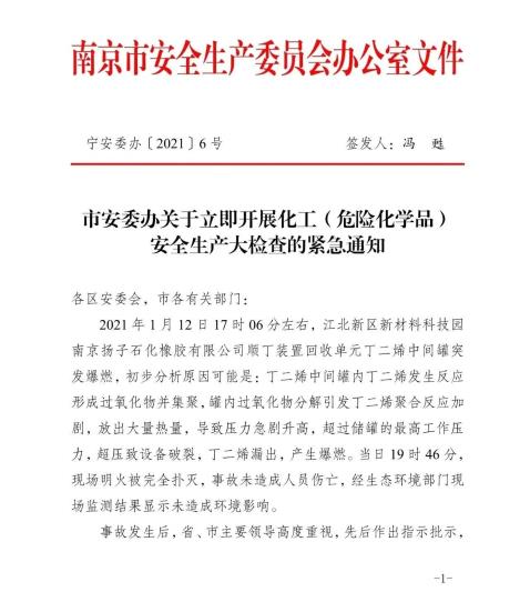 1月15日,南京市应急管理局公布:2021年1月12日17时06分左右,南京扬子石化橡胶有限公司顺丁装置回收单元丁二烯中间罐突发爆燃,所幸事故未造成人员伤亡。经过有关部门的初步调查分析,事故原因可能是:丁二烯中间罐内丁二烯发生反应形成过氧化物并集聚,罐内过氧化物分解引发丁二烯聚合反应加剧,放出大量热量,导致压力急剧升高,超过储罐的最高工作压力,超压致设备破裂,丁二烯漏出,产生爆燃。