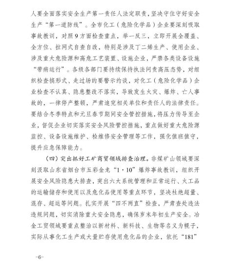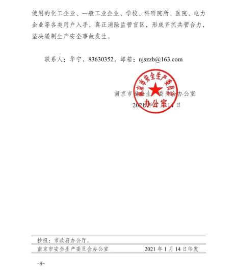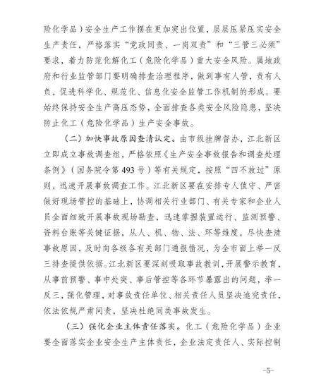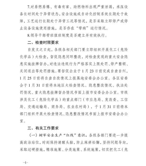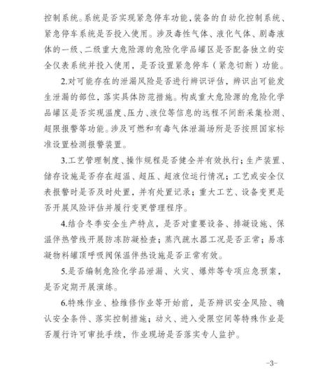 事故发生后,江苏省安委会办公室出台《关于立即组织开展化工(危险化学品)安全生产大检查的通知》(苏安办电〔2021〕3号),要求各地、各部门要深刻汲取事故教训,结合冬季化工(危险化学品)安全生产特点,立即组织开展化工(危险化学品)安全生产大检查。对化工(危险化学品)企业生产装置、储存设施重点检查以下8个内容:1. 涉及重点监管危险化工工艺的生产装置,是否设置自动化控制系统。系统是否实现紧急停车功能,装备的自动化控制系统、紧急停车系统是否投入使用。涉及毒性气体、液化气体、剧毒液体的一级、二级重大危险源的危险化学品罐区是否配备独立的安全仪表系统并投入使用,是否设置紧急停车(紧急切断)功能。2. 对可能存在的泄漏风险是否进行辨识评估,辨识出可能发生泄漏的部位,落实具体防范措施。构成重大危险源的危险化学品罐区是否实现温度、压力、液位等信息的远程不间断采集检测、超限报警等功能。涉及可燃和有毒气体泄漏场所是否按照国家标准设置检测报警装置。3. 工艺管理制度、操作规程是否健全并有效执行;生产装置、储存设施是否存在超温、超压、超液位运行情况;工艺或安全仪表报警时是否及时处置,并有处置记录;重大工艺、设备变更是否开展风险评估并履行变更管理程序。4. 结合冬季安全生产特点,是否对重要设备、排凝设施、保温伴热管线开展防冻防凝检查;蒸汽疏水器工况是否正常;易冻凝物料罐顶呼吸阀保温伴热设施是否正常有效。5. 是否编制危险化学品泄漏、火灾、爆炸等专项应急预案,是否定期开展演练。6. 特殊作业、检维修作业等开始前,是否辨识安全风险、确认安全条件、落实控制措施;动火、进入受限空间等特殊作业是否履行许可审批手续,作业现场是否落实专人监护。7. 对易燃易爆、有毒有害、助燃物料出现严重泄漏,承压设备长时间处于异常状态,安全设施或自动化控制系统长期处于故障,工艺运行长期处于异常工况等情况,是否采取立即停产或停止设备设施使用措施,是否存在“带病”运行情况。